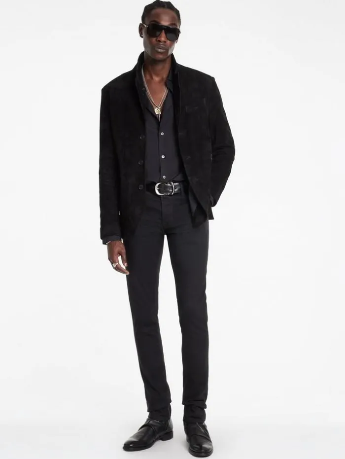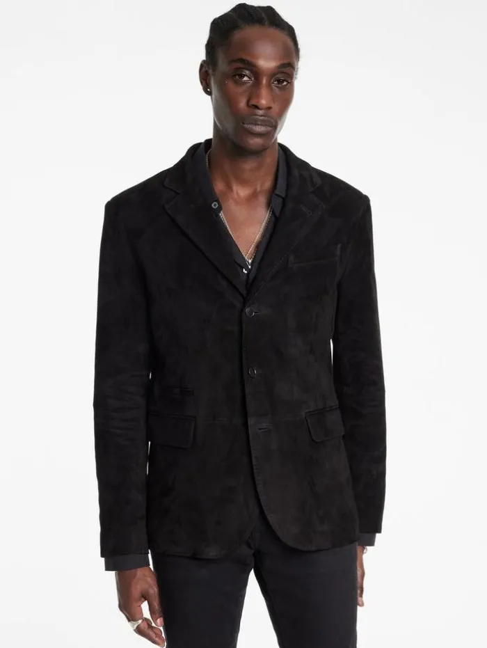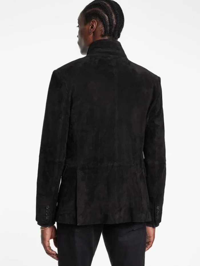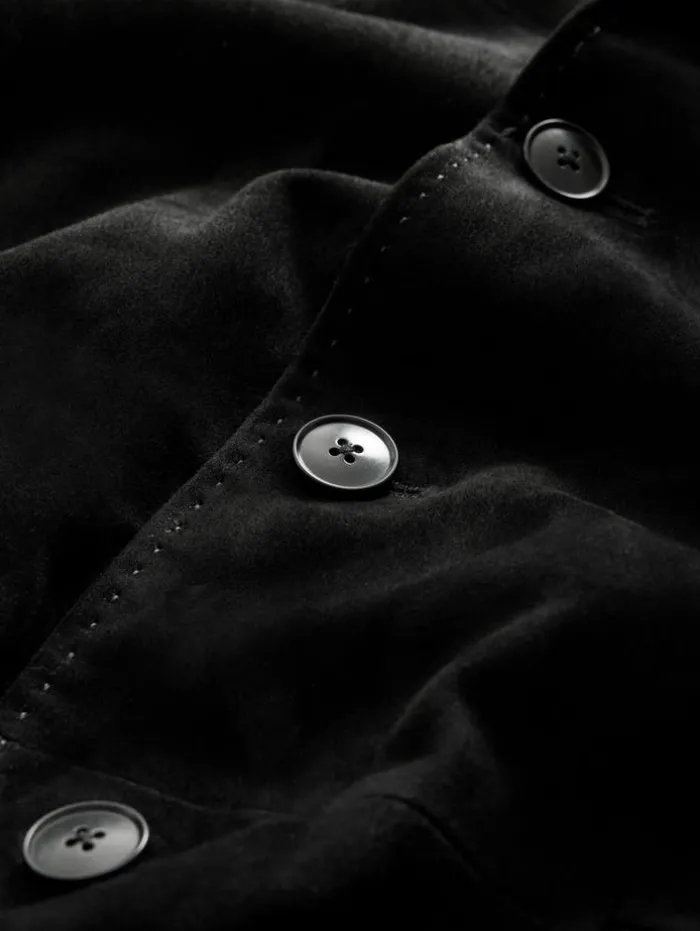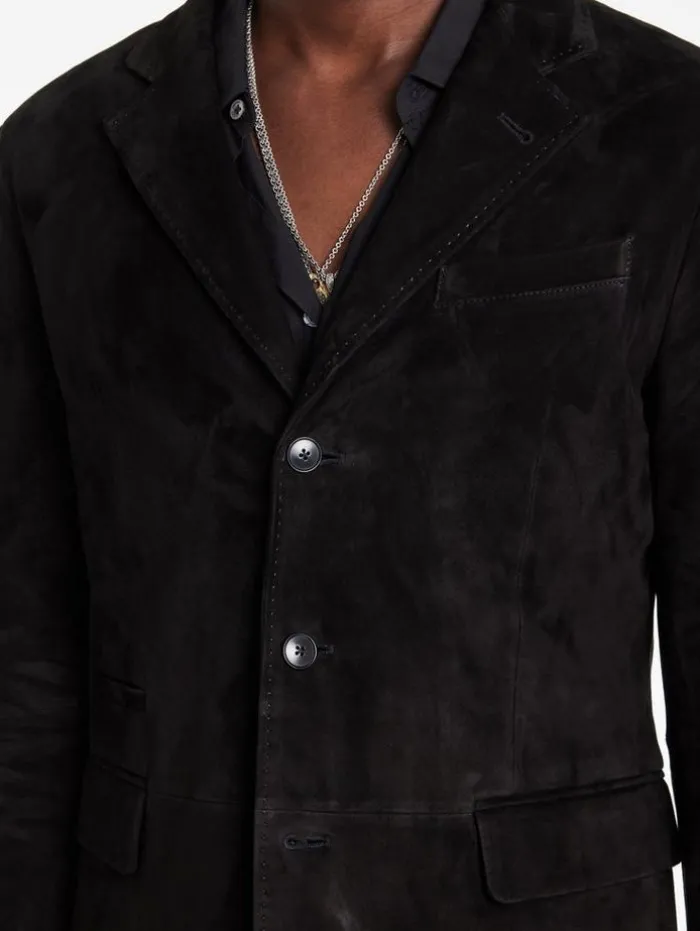 Each thread of our Rind Jacket narrates a tale of classic luxury and exceptional craftsmanship. Expertly crafted from the finest goat suede, this jacket features a classic silhouette enhanced by a refined notch lapel, lending a touch of traditional charm. Its functional flap hip pockets enhance its practicality contributing to its sleek, modern profile. Draped in the Rind, you embody the essence of modern elegance, where every detail is a nod to both past and present.100% Goat SuedeLining: 100% CuproProfessional Dry Clean by Leather Expert Three Button ClosureNotch LapelLong SleeveSlim FitSingle BreastFlap Hip PocketMeasurements: Front Body Length: 30cm, Center Back Body Length: 29cm, Across Shoulder: 18.5cm, Chest: 20.625cm Flat, Sleeve Length: 26.25cm