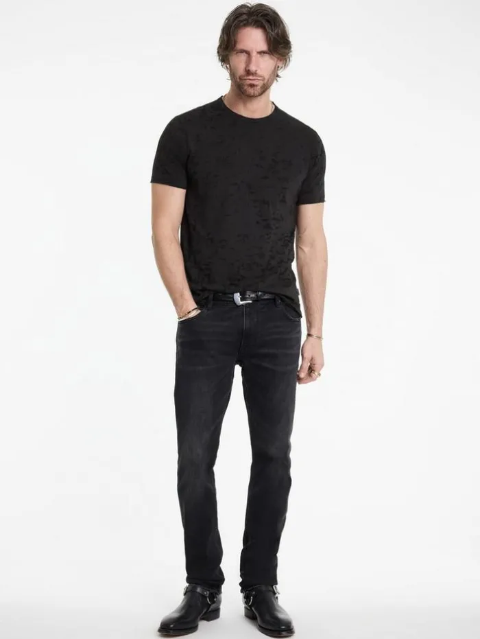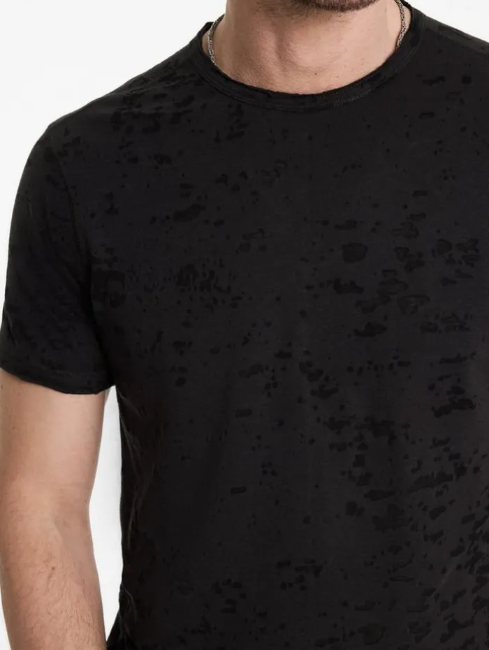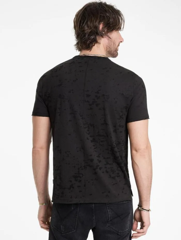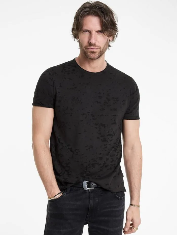 Every detail in our Eden Burnout Crew speaks volumes. Slip on this organic cotton blend tee for effortless cool. Its burnout pattern weaves through the fabric, enhanced by seams highlighted with vertical pickstitching. Its timeless silhouette features a side slit for exceptional comfort, while raw edge trims along the neck, cuffs, and hem infuse a rugged touch. Our signature flag label on the side marks its authenticity and quality craftsmanship.60% Organic Cotton, 40% PolyesterMachine Wash ColdCrew NeckPulloverShort SleeveRaw Edge DetailSignature Flag LabelMeasurements: Body Length: 27.5″, Chest Width (Flat): 20.5″, Sleeve Length: 17.5″