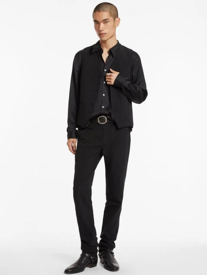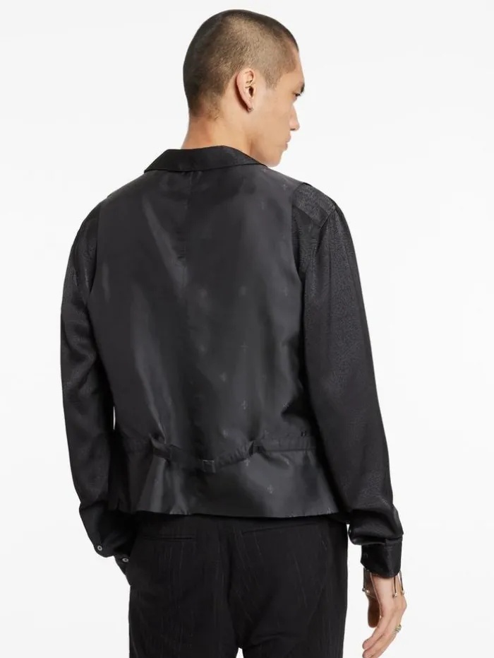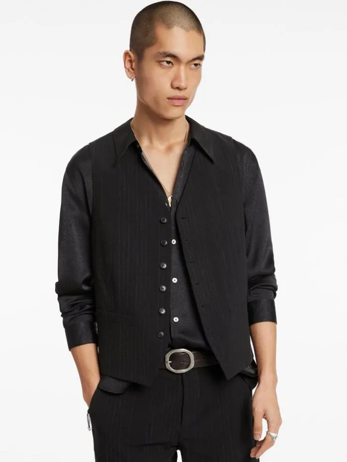Exemplifying JV’s sartorial mastery, the Wooster Vest offers a seamless blend of tradition and contemporary finesse. This collarless design, a classic JV Wooster, is accentuated with front body darts and welt hip pockets, reflecting meticulous tailoring. It’s crafted from Italian fabric adorned with a sophisticated pin stripe pattern, adding an element of refined elegance. The absence of a collar lends a modern touch to its silhouette, making the vest versatile for various styling options. Whether paired with complementary suiting for a cohesive ensemble or worn over a tailored shirt as a stand-alone statement piece, the Wooster Vest is a testament to timeless style and impeccable craftsmanship. 77% Cotton, 21% Linen, 2% Virgin WoolLining: 100% CuproDry Clean OnlyMulti-Button FrontFront Body DartsWelt Hip PocketsItalian Pin-Stripe Pattern FabricMade In ItalyMeasurements: Front Body Length: 25.625”, Center Back Body Length: 23.5”, Across Shoulder: 14.5”, Chest: 20.5”