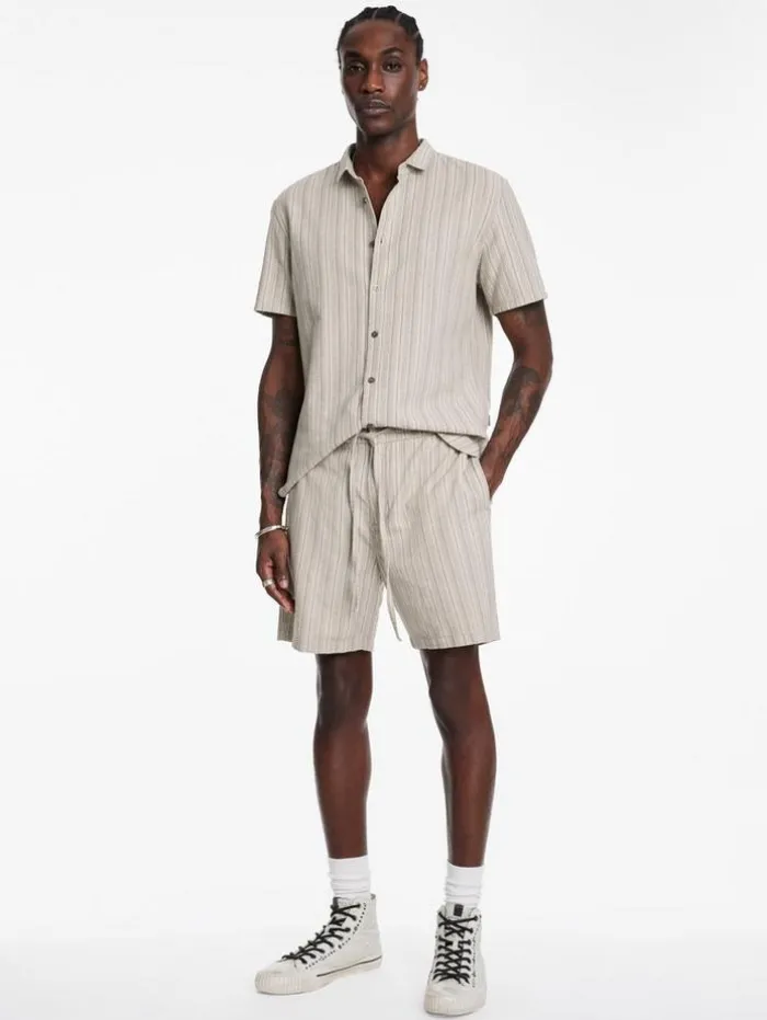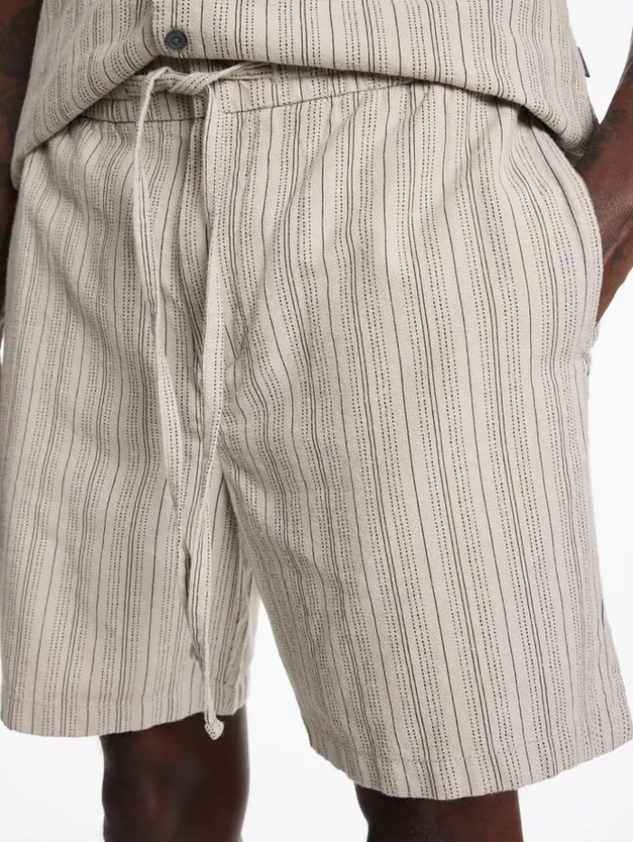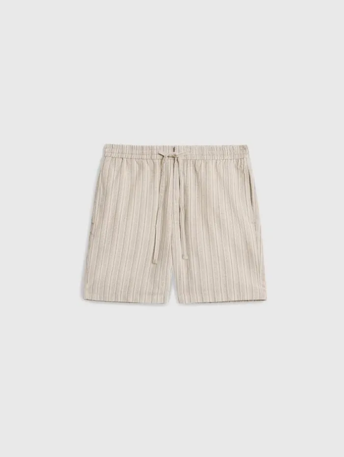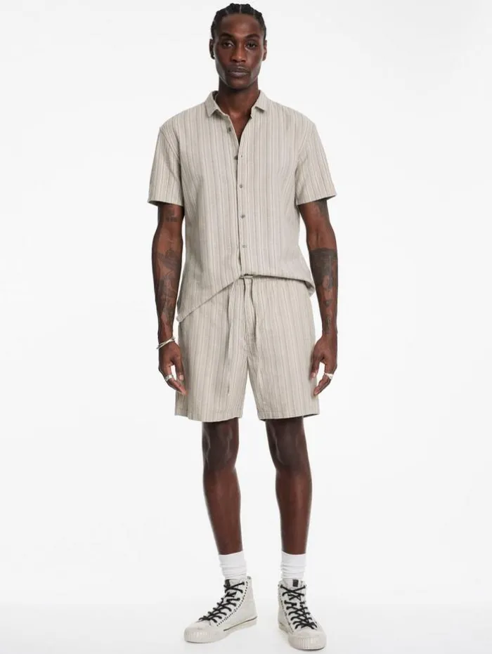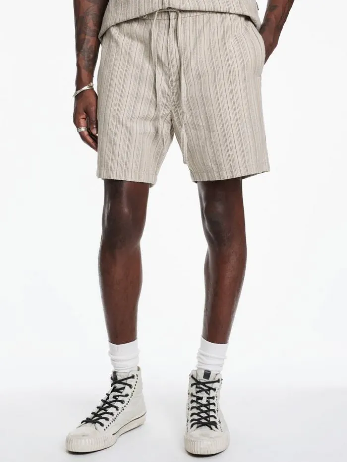 Enhance your casual wardrobe with the style and comfort of our Daryl Shorts. Designed with a focus on relaxed elegance, featuring a convenient drawstring waist for an adjustable fit. Crafted from a unique striped cotton-hemp blend, they offer the softness of cotton with the durability and eco-friendly benefits of hemp. The shorts are equipped with side seam pockets and backside welt pockets, providing practicality without compromising their sleek silhouette. Ideal for laid-back days or leisurely outings, the Daryl Shorts add a touch of sophistication to your everyday attire.90% Cotton, 10% Hemp Machine Wash Cold DrawstringSide Seam PocketsBack Welt PocketsStripe Print FabricMeasurements: Waist: 16.75″, Leg Opening: 11.25″, Inseam: 6.5″
