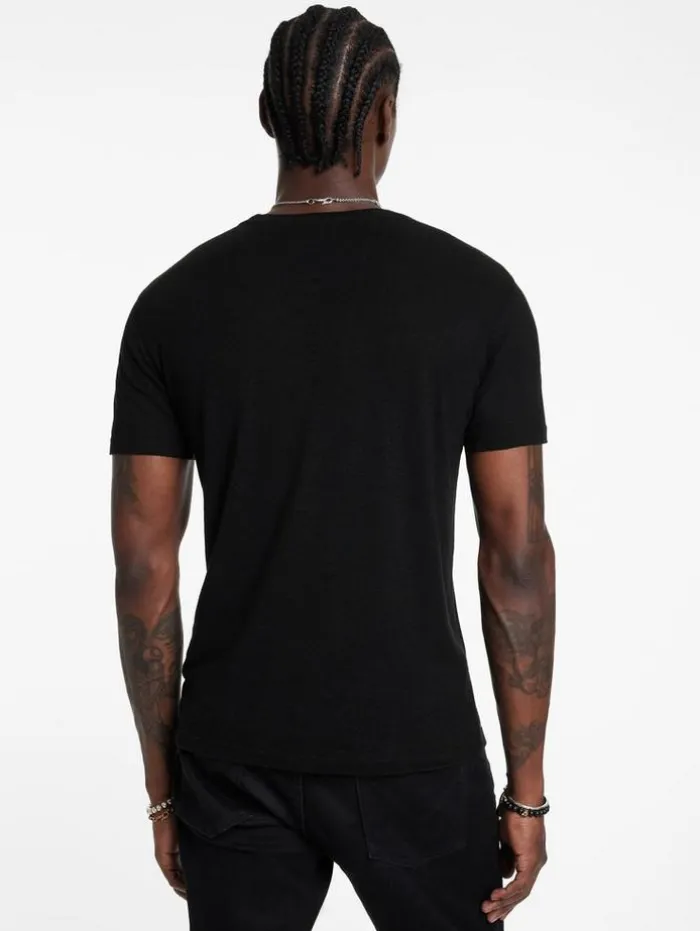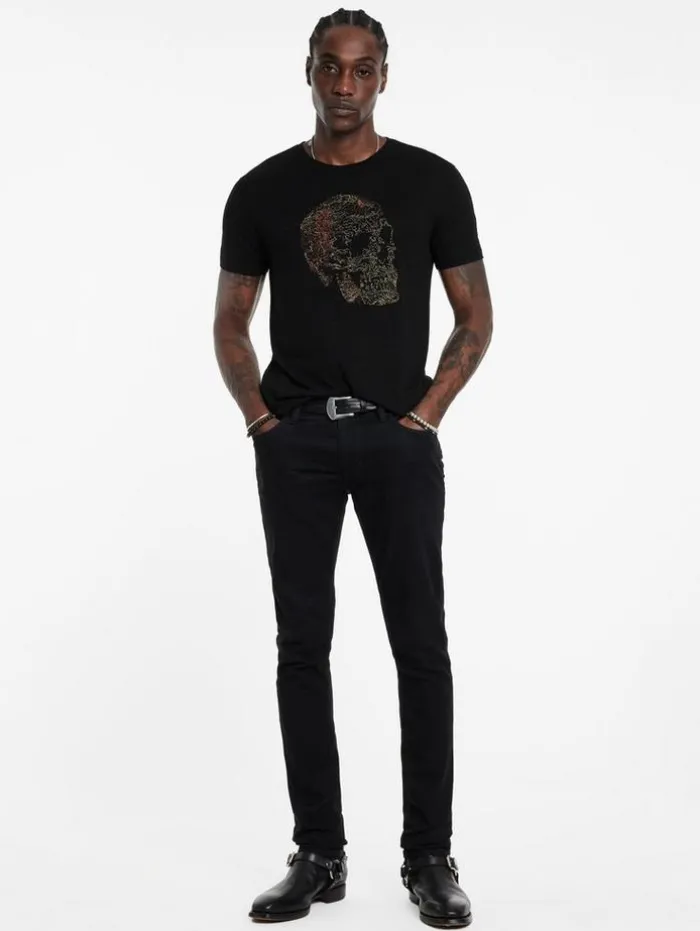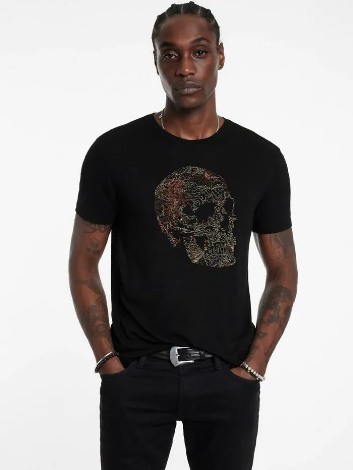 A statement tee for weekend looks, this piece is crafted from a soft linen and modal blend, balancing comfort with character. It features an intricate skull motif, embroidered artfully with a spectrum of multi-colored threads and subtle metallic accents. A soon-to-be favorite in your wardrobe, pair it with our Ethan Wash jeans and low-top sneakers for a relaxed yet refined appearance that transitions effortlessly from day to night.55% Linen, 45% Modal Machine wash coldCrewneckShort sleeveSkull artworkMulti-colored embroideryMeasurements: Body Length: 27.5″, Chest Width: 20.5”, Shoulder Width: 18”, Sleeve Length: 16.75″