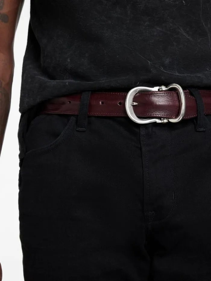Crafted with a 35mm strap of smooth veg-tanned calf leather, this belt is a testament to artisan craftsmanship and contemporary design. Lined with full-grain calf for durability and comfort, it features a hand-casted pewter buckle reminiscent of a guitar hinge, detailed with brass pins and finished in antique nickel, exuding a vintage yet modern appeal. Made in Italy and assembled with the buckle crafted in England, this sophisticated accessory enhances any formal or casual outfit with a touch of renowned elegance. 100% Cow LeatherLining: Full Grain Calf LeatherProfessional Dry CleanBy Leather Expert35mmHand-Casted Pewter ‘Guitar Hinge’ BuckleBrass Pin DetailingAntique Nickel FinishingBuckle Crafted in EnglandBelt Made in Italy