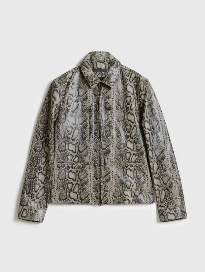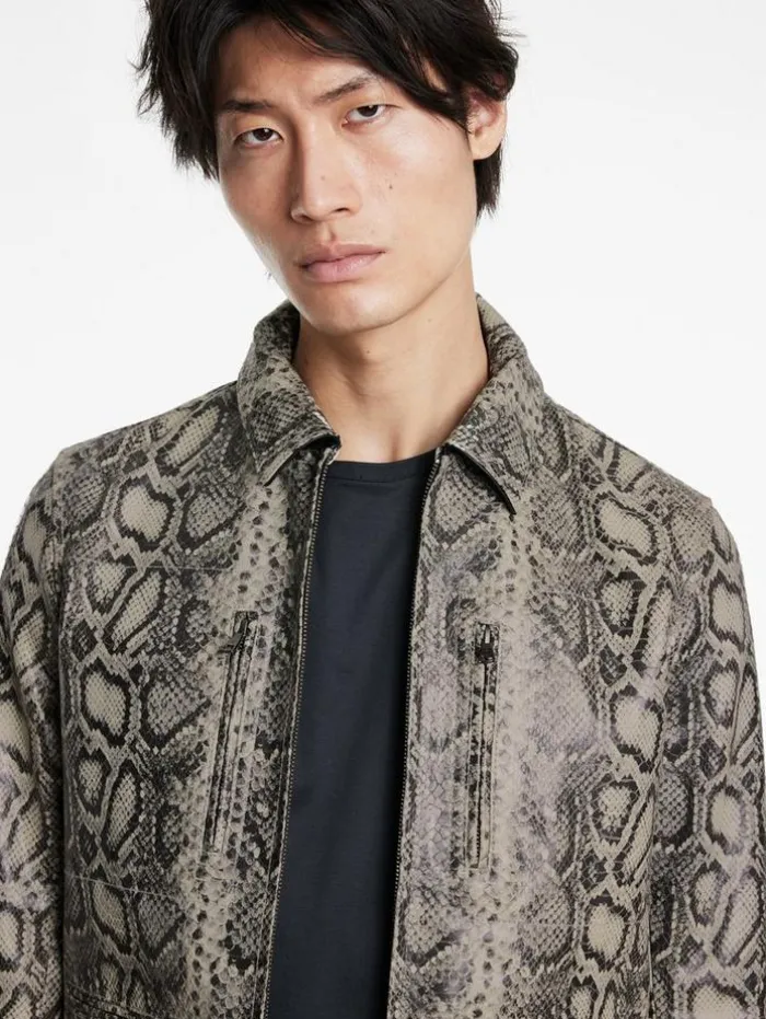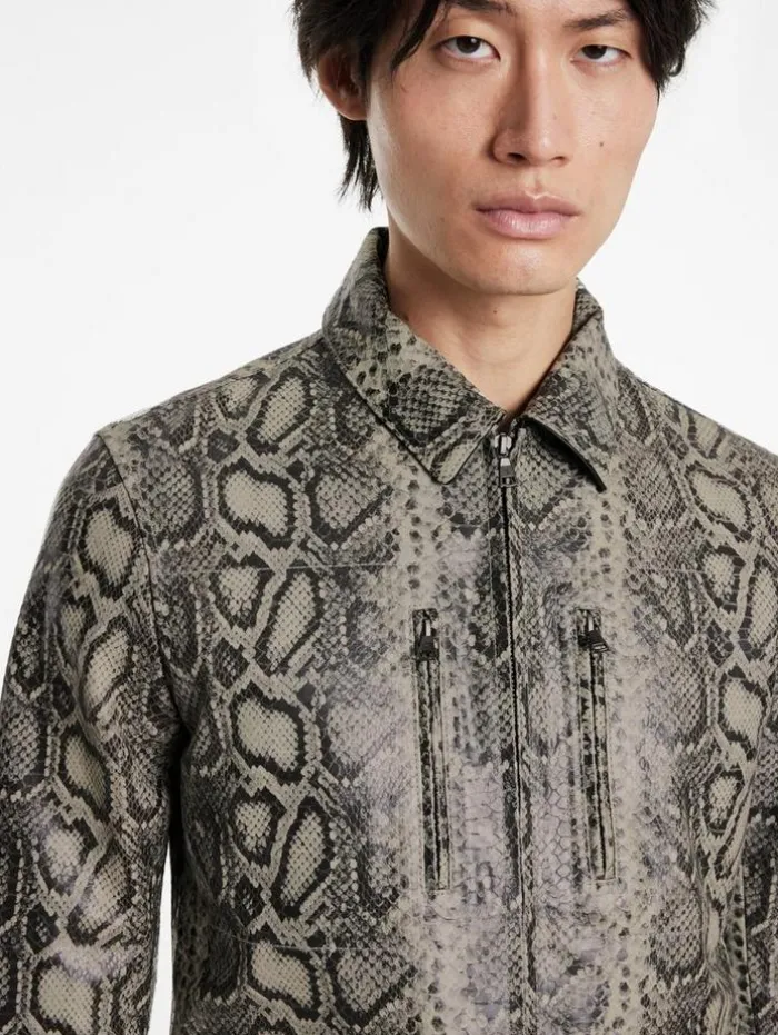 Declare your presence in the Gryffin Jacket, a second skin infused with rock defiance. Wrapped in snake foil printed sheep leather, this jacket isthe standout piece of our Fall ‘24 collection. Finished with a sleek zip front and functional zipper pockets, further enhancing its edge. Donned over any casual ensemble, the Gryffin instantly elevates your presence to an unabashed level, proclaiming a lifestyle as bold as the leather it’s cut from.100% Sheep LeatherProfessional Dry Cleaned By Leather ExpertCollarFront Zipper ClosureLong SleevesZipper PocketsSnake Foil PrintMeasurements: Body Length: 26.25″”, Chest Width (Flat): 21.5″”, Shoulder Width: 18.5″”, Sleeve Length: 26.25″”
