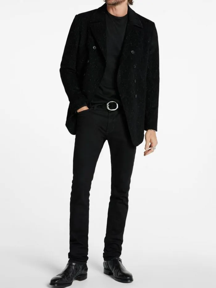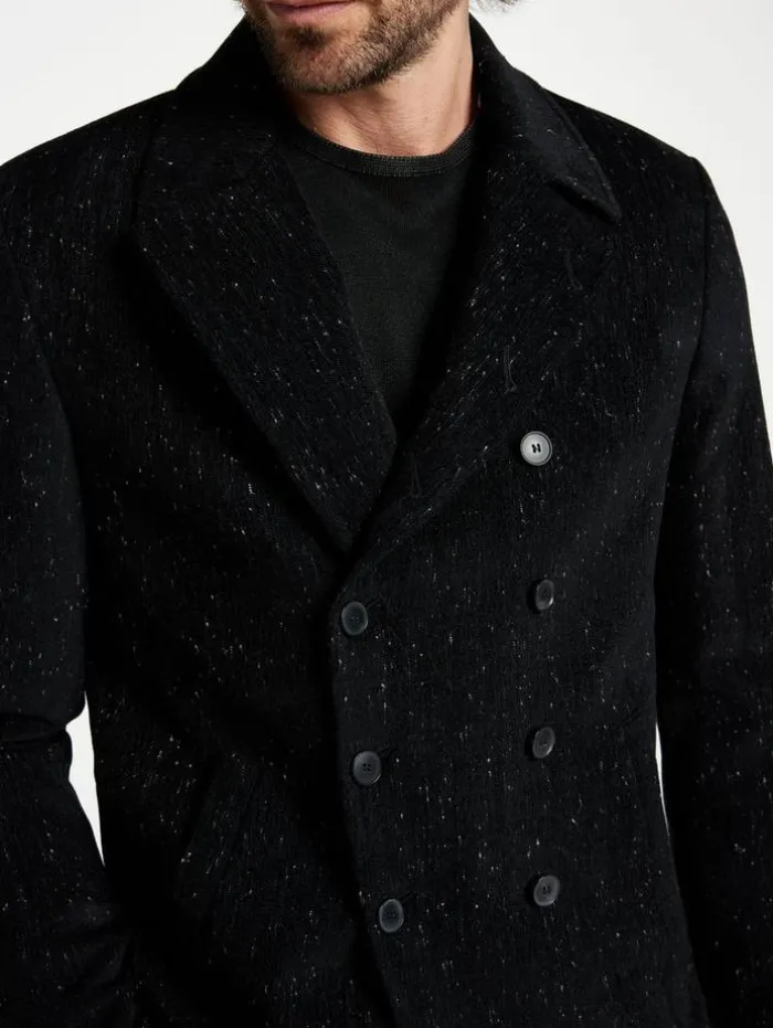 The Hart Peacoat embodies Italian finesse. This double-breasted design, distinguished by its cutaway front shape, merges traditional elegance with a contemporary twist. Expertly crafted from premium Italian fabrics, this coat showcases a unique interplay of thin silk stretch and melange yarn. The addition of chenille yarn creates an exclusive mottled effect, lending a touch of artistic distinction to its appearance. 46% Viscose, 40% Wool, 13% Cotton, 1% ElastaneDry Clean OnlyCollarButton ClosureLong SleeveDouble-BreastedMade In ItalyFront Body Length HPS: 82.5cm, Center Back Body Length: 77cm, Across Shoulder: 47cm, Chest: 55cm Flat, Sleeve Length : 26″