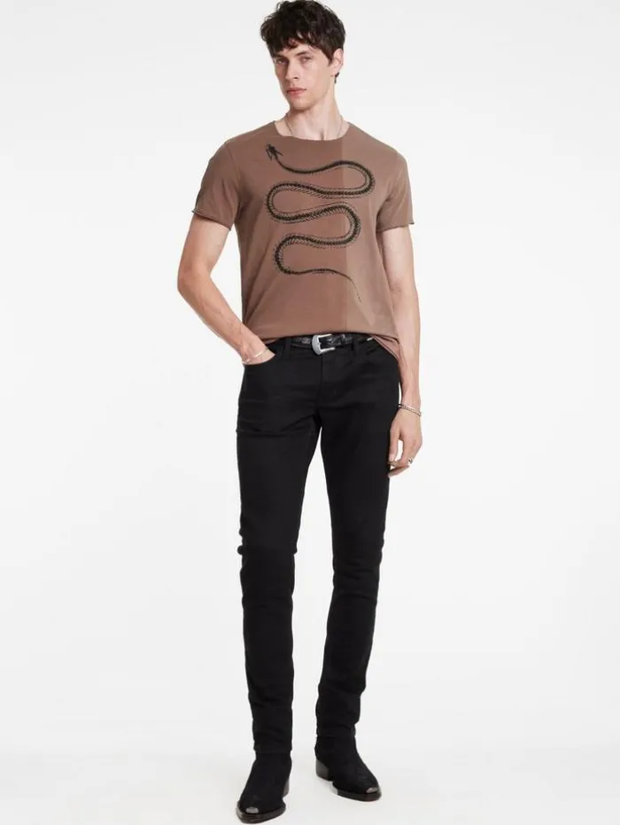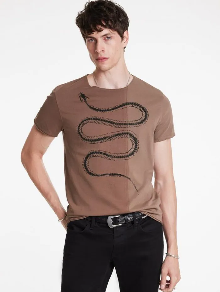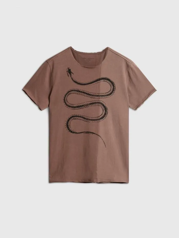 Some snakes are meant to be seen – our Snake Bones Tee is one of them, combining raw edge seams with comfortable organic cotton construction. The snake skeleton design printed across the seams delivers a strong visual impact with a vintage allure. Throw it on with your trusted jeans and a jacket for a look that refuses to lurk in the shadows.100% Organic CottonMachine Wash ColdCrew NeckShort SleeveRaw Edge DetailSnake Skeleton ArtworkMeasurements: Body Length: 28″, Chest Width (Flat): 20.5″, Sleeve Length: 16.75″