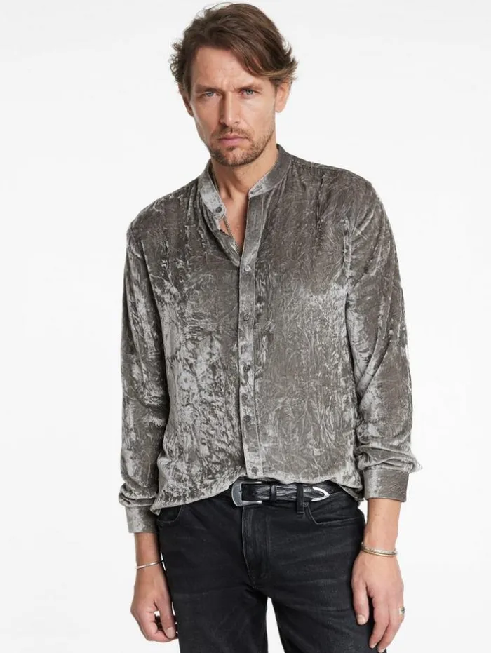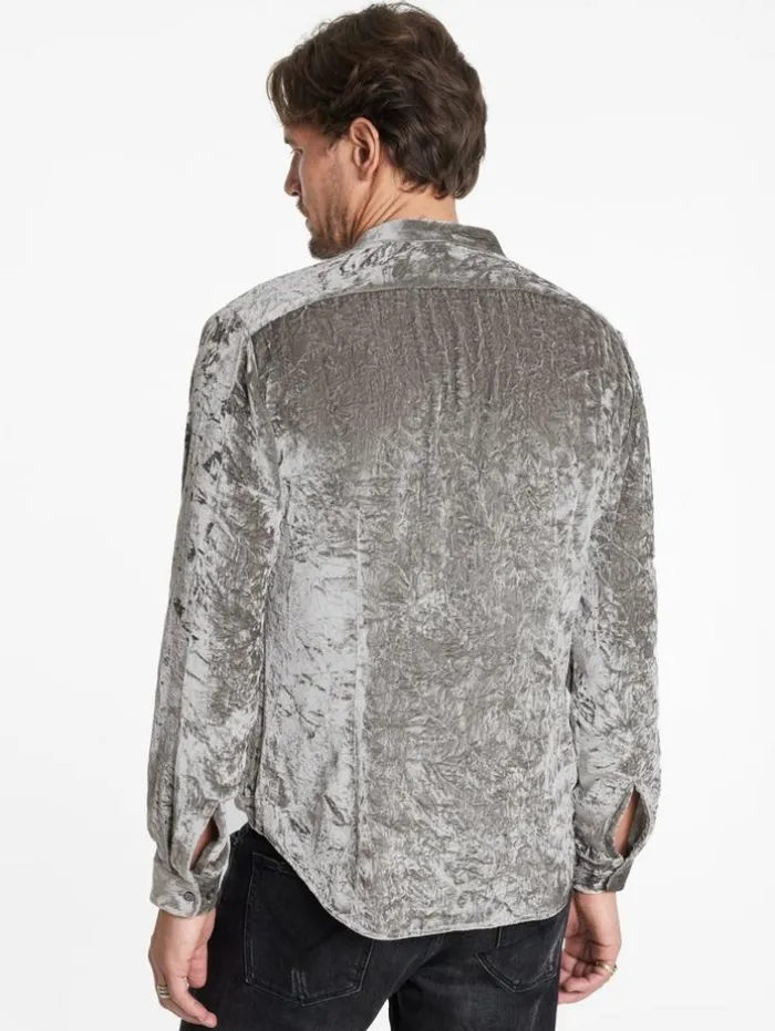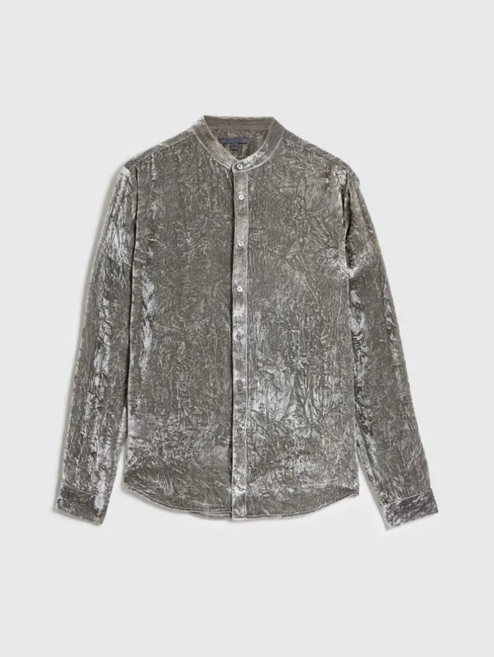 Immersed in a bold smoky pearl grey hue, the Vigo Shirt captivates with its fluid velvet composition, crafted with silk chiffon at the base and a viscose pile that’s both rounded and soft. This slim-fit shirt features a modern band collar and precise back side darts, sculpting a refined silhouette. The unique wrinkled surface, achieved through a specialized crushing mechanism, enhances the velvet’s three-dimensional effect and dynamic interplay of color and light. This method creates an ever-changing visual spectacle that perfectly embodies the spirit of our Renascence collection.80% Viscose, 20% SilkDry Clean OnlyLong SleeveButton Front ClosureWrinkled EffectMeasurements: Body Length: 76cm, Chest (Flat): 54.5cm, Sleeve Length: 65cm, Neck Circumference: 45cm