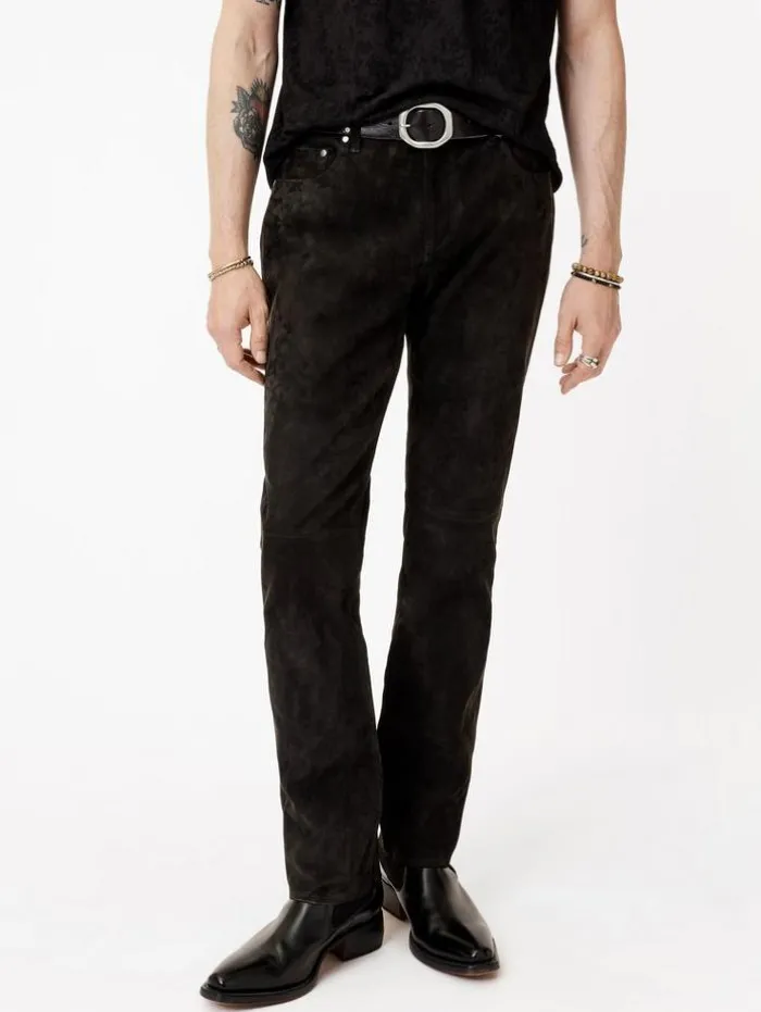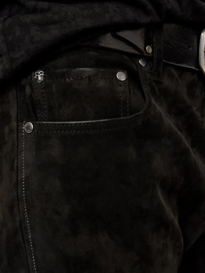 Five-pocket pants crafted from supple lamb suede blend versatility with an edge. Notable ball and chain detailing along the side seams inject a rebellious touch into this regular-fit design, pairing seamlessly with casual and formal wear.100% Lamb SuedeProfessional dry clean by leather expertSkinny fitFive pocketsZip and button closureBall and chain detailingMeasurement: Waist: “, Hip: 41”, Inseam: 32”