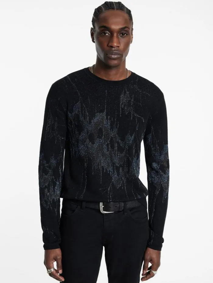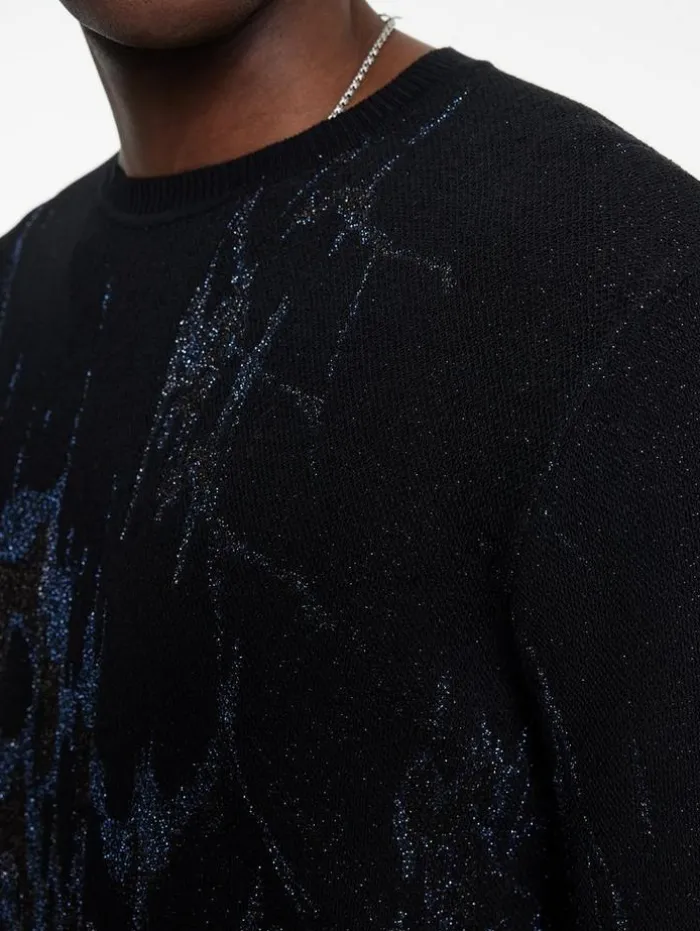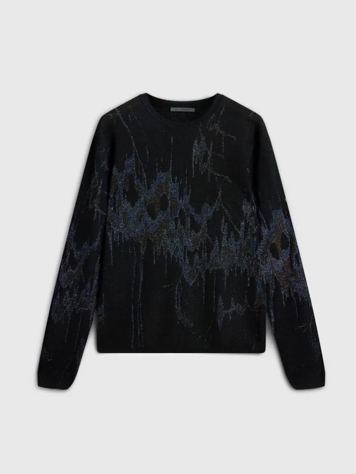 Capturing the celestial wonder of the night sky, our Hilo Crew Sweater is a marvel of cosmic artistry. It features a dynamic, multi-color jacquard pattern designed to mimic the Milky Way, enveloping you in the beauty of a star-studded abyss. Finely knit and finished with ribbed neck, cuffs, and hem, this sweater offers a snug and tailored fit. A discreet flag label at the side seam adds a subtle signature touch.52% Polyamide, 38% Cotton, 10% Metallized FiberHand Wash ColdCrew NeckLong SleeveMulticolored JacquardRibbed DetailingFlag Label At Side SeamMeasurements: Body Length: 26.5″, Chest (Flat): 20.5″, Sleeve Length: 34.5″