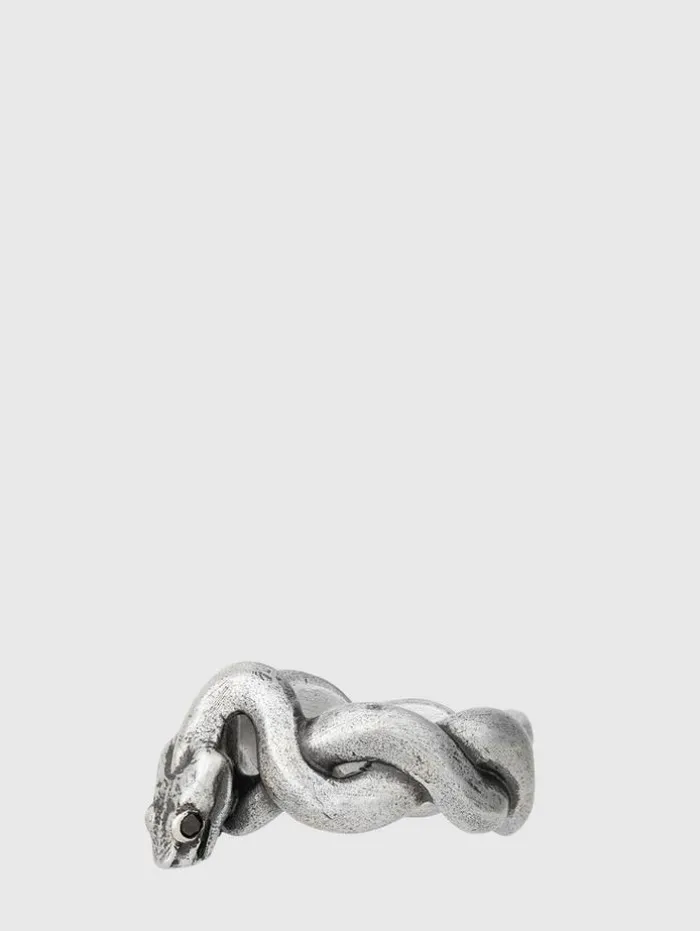 The Snakeskin Band Ring builds on our return to rarified design this season. Handcrafted in Istanbul, the ring features a coiled serpent motif, its intricate form wrapping around your finger, symbolizing eternal strength and protection. The weathered texture and piercing black diamond eye reflect the fierce elegance of the snake, delivering a look that’s as powerful as it is refined. Wear it solo for a statement that stands on its own, or stack it against our other Fall ’24 rings to create a look that is distinctively yours. Sterling SilverBand Width: 10 mmHeight Off Finger: 6.88 mmSnake MotifBlack Diamond EyeHandcrafted in Turkey