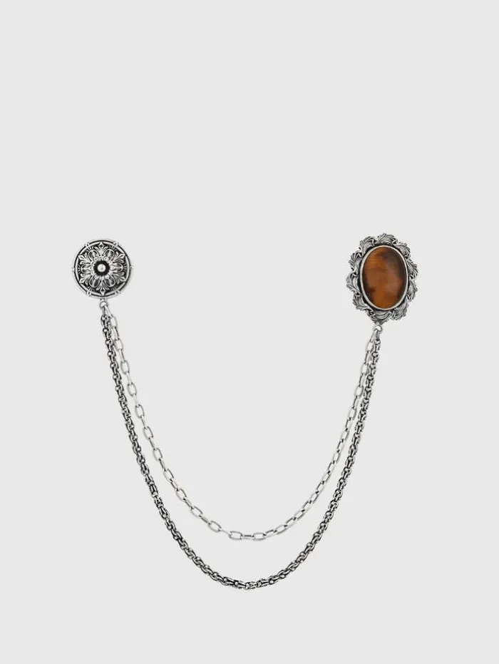 Elevate your John Varvatos suiting with our Link Pin. This lapel brooch features intricate floral motifs, encapsulated in a round sterling silver setting alongside an oval Tiger’s Eye stone, showcasing rich, natural hues. A finely crafted sterling silver chain connects these elegant elements, providing a sophisticated yet bold accent to any ensemble. Sterling SilverTiger Eye StoneLength: 8.50 inchesPendant: 41.0×29.50 mm-29.0×24.50 mmLink PinRound and Oval Floral MotifHandcrafted in Turkey