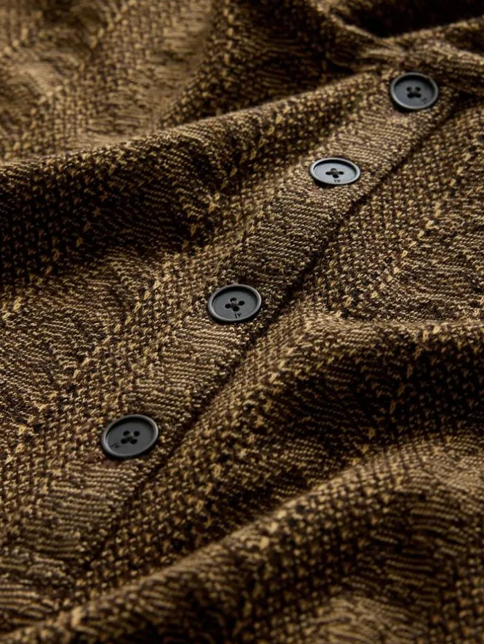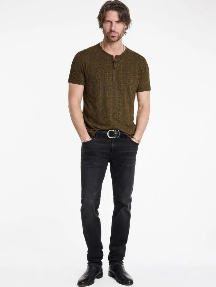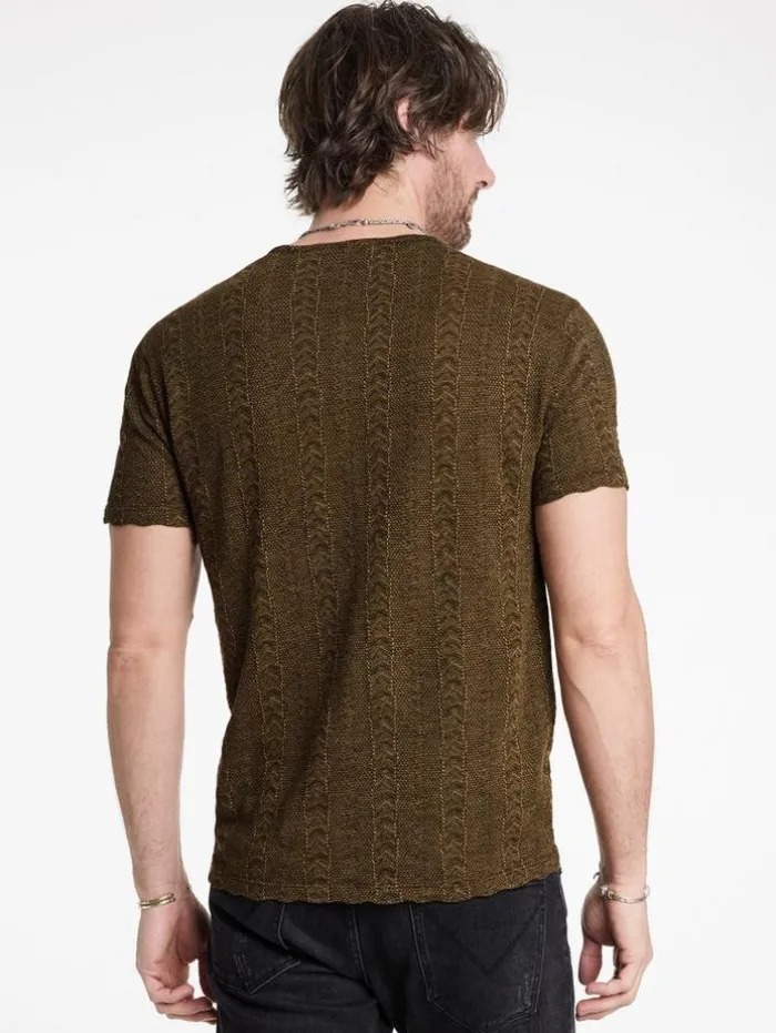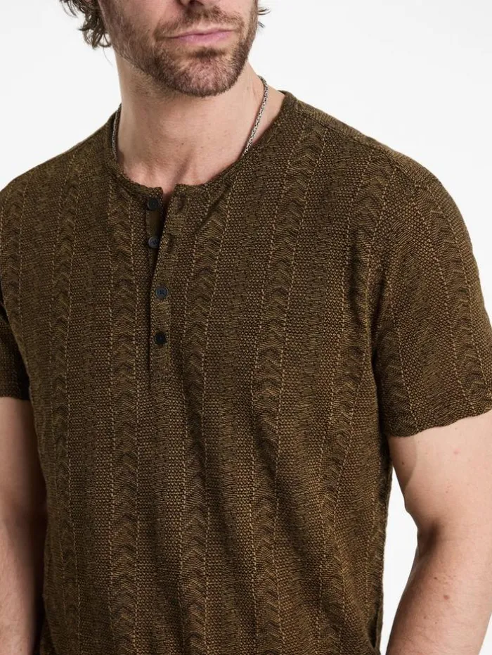 Expertly designed, the Madoc Henley exudes bold character without sacrificing comfort. This piece is intricately woven from three distinct color yarns into a textured jacquard fabric, creating striking visual depth. This henley features a four-button central front placket that lends a touch of refinement, while a discreet flag label on the side underscores our commitment to quality. It effortlessly complements both denim or casual pants, enhancing any ensemble with its understated luxury.50% Viscose, 30% Polyester, 20% Organic CottonMachine Wash ColdShort SleeveFour-Button PlacketTextured Jacquard FabricJV Flag LabelMeasurements: Body Length: 27.5″, Chest Width (Flat): 20.5″, Sleeve Length: 17.5″