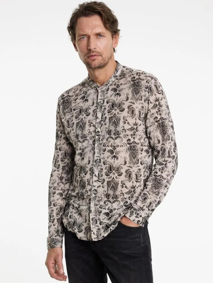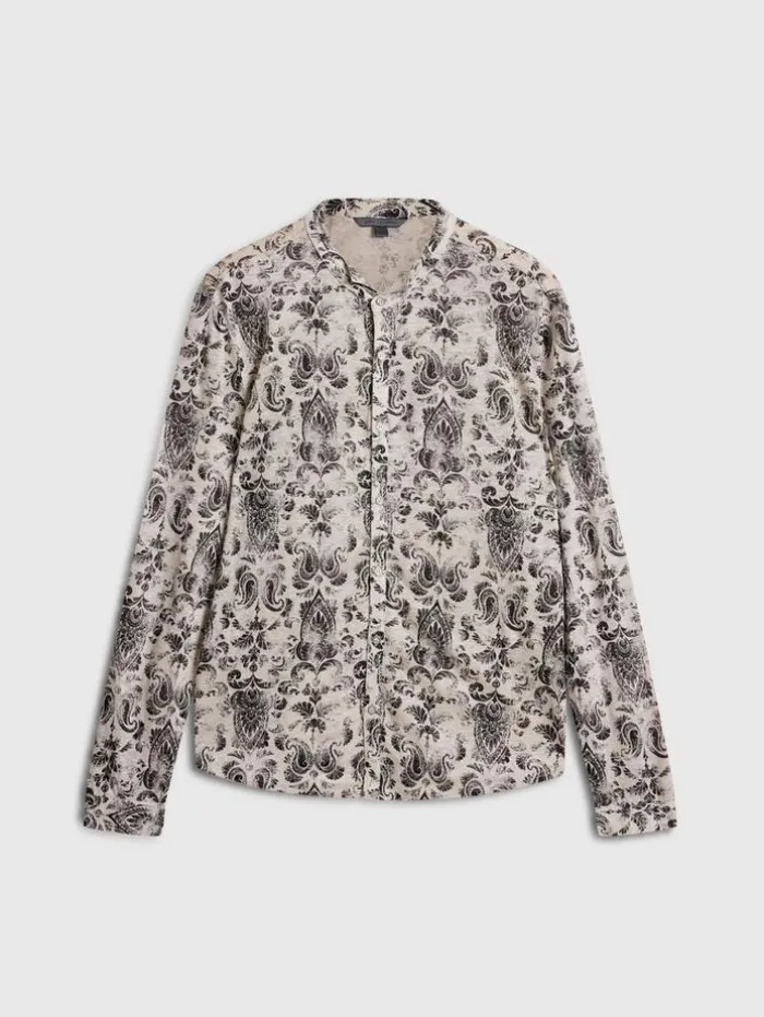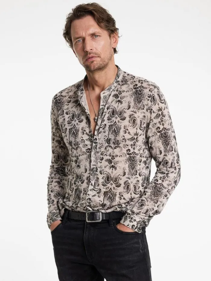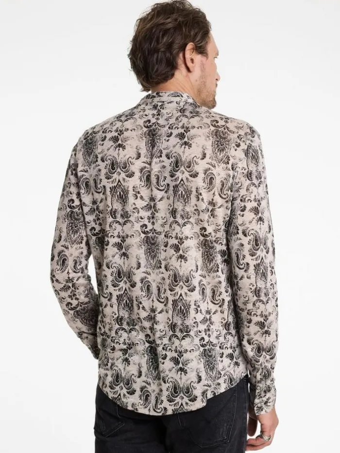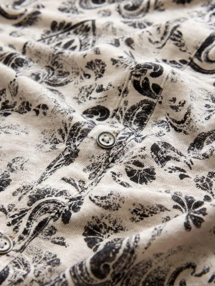The paisley print enlivens our Padria Shirt, crafting a sophisticated narrative with every thread. Rendered in a seal grey palette and made from linen, this regular-fit long-sleeve shirt boasts a breathable, subtly textured fabric that combines comfort with style. The distinctive wingtip collar and antiqued metal buttons inject a touch of vintage elegance, forging a look that’s both timeless and contemporary. Finished with a classic shirt tail hem, the Padria Shirt is a must-have for a sophisticated autumn wardrobe.100% LinenHand Wash ColdRegular-FitLong SleeveWingtip CollarAntiqued Metal Button ClosurePaisley PrintTail Hem FinishMeasurements: Body Length: 28.5″, Chest Width (Flat): 21.25″, Sleeve Length: 34.75″