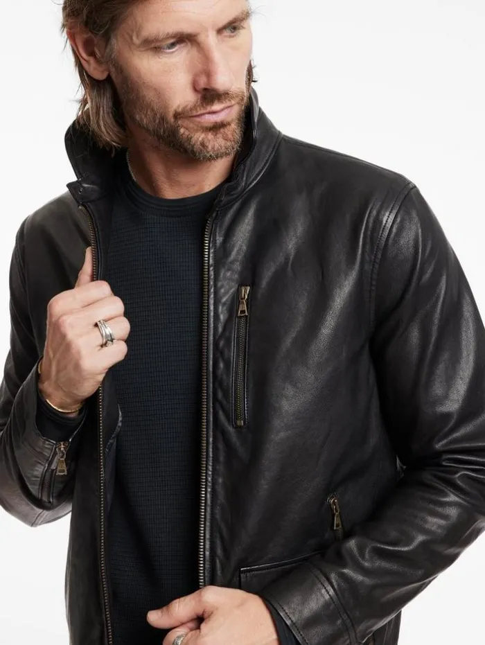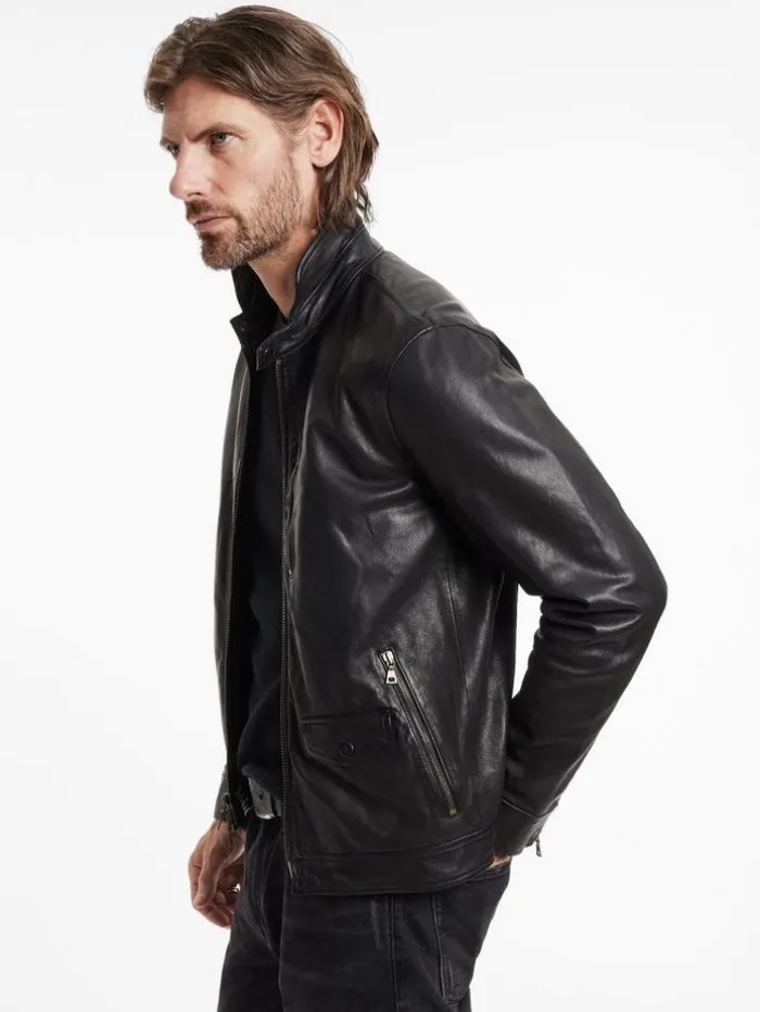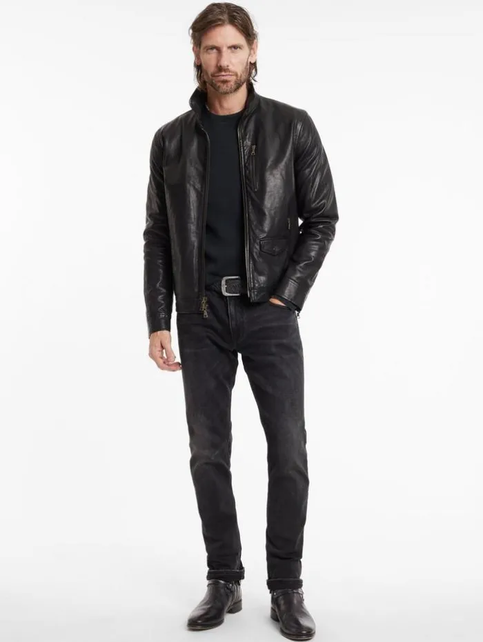 Ease into winter styling with the York Jacket. A simple leather silhouette with refined finishes. It has a wire collar for added structure and the leather’s been burnished for a slightly worn-in feel. The vintage look is complemented by brass hardware for a fully authentic aesthetic.100% Goat LeatherLining: 100% Cupro Vertical Zipped Chest PocketDual Zip Side PocketsWire Inserted Collar With Snap ClosureSnap CuffsDual Zip Front Closure